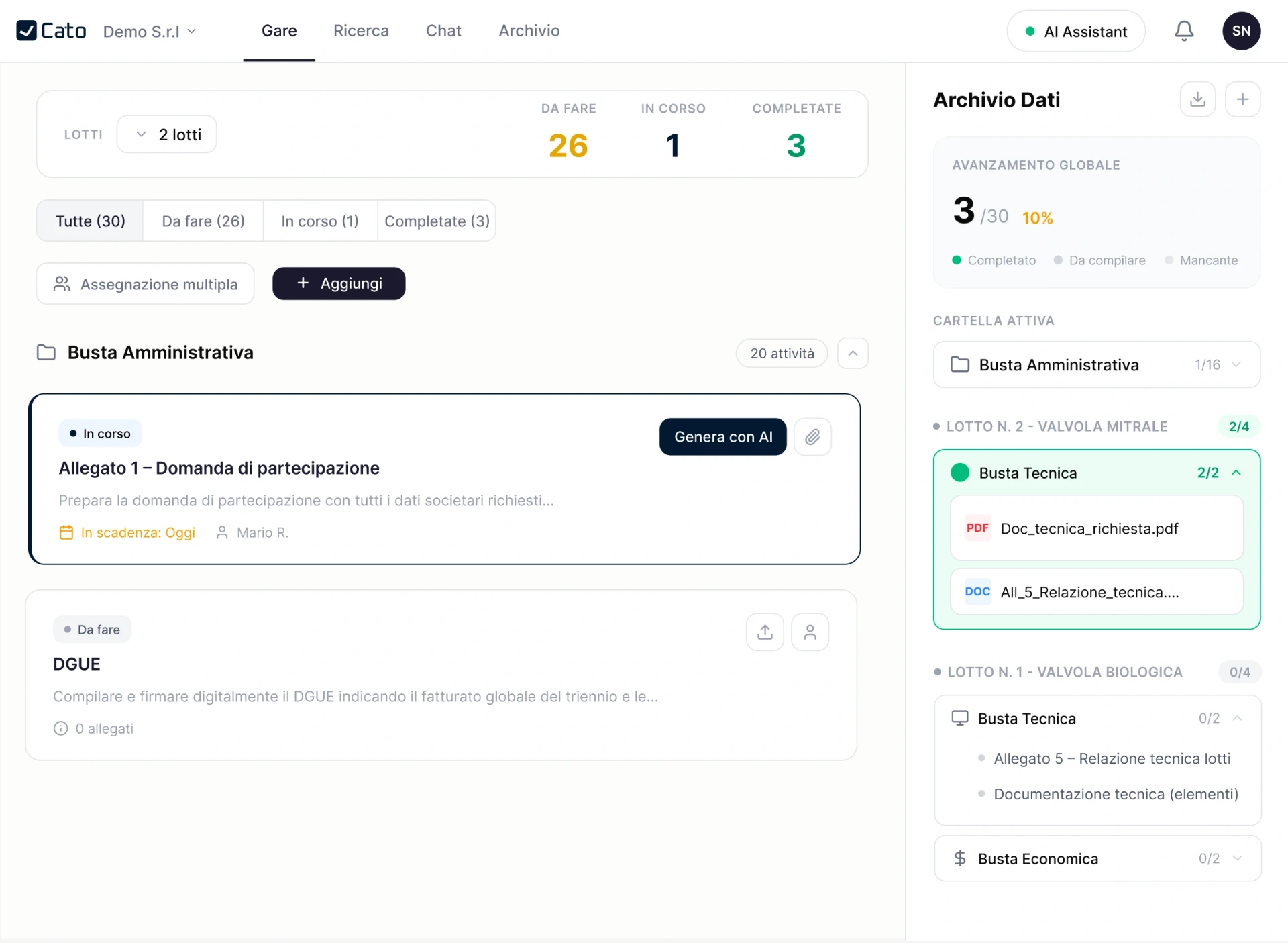 Vedi solo le opportunità realmente rilevanti per il tuo business, filtrate su settore, categorie, requisiti e storico aziendale, concentrandoti solo su ciò che ha valore Accedi a tutte le principali fonti di gara in un unico flusso già strutturato e uniforme, senza dover cercare manualmente tra portali diversi.